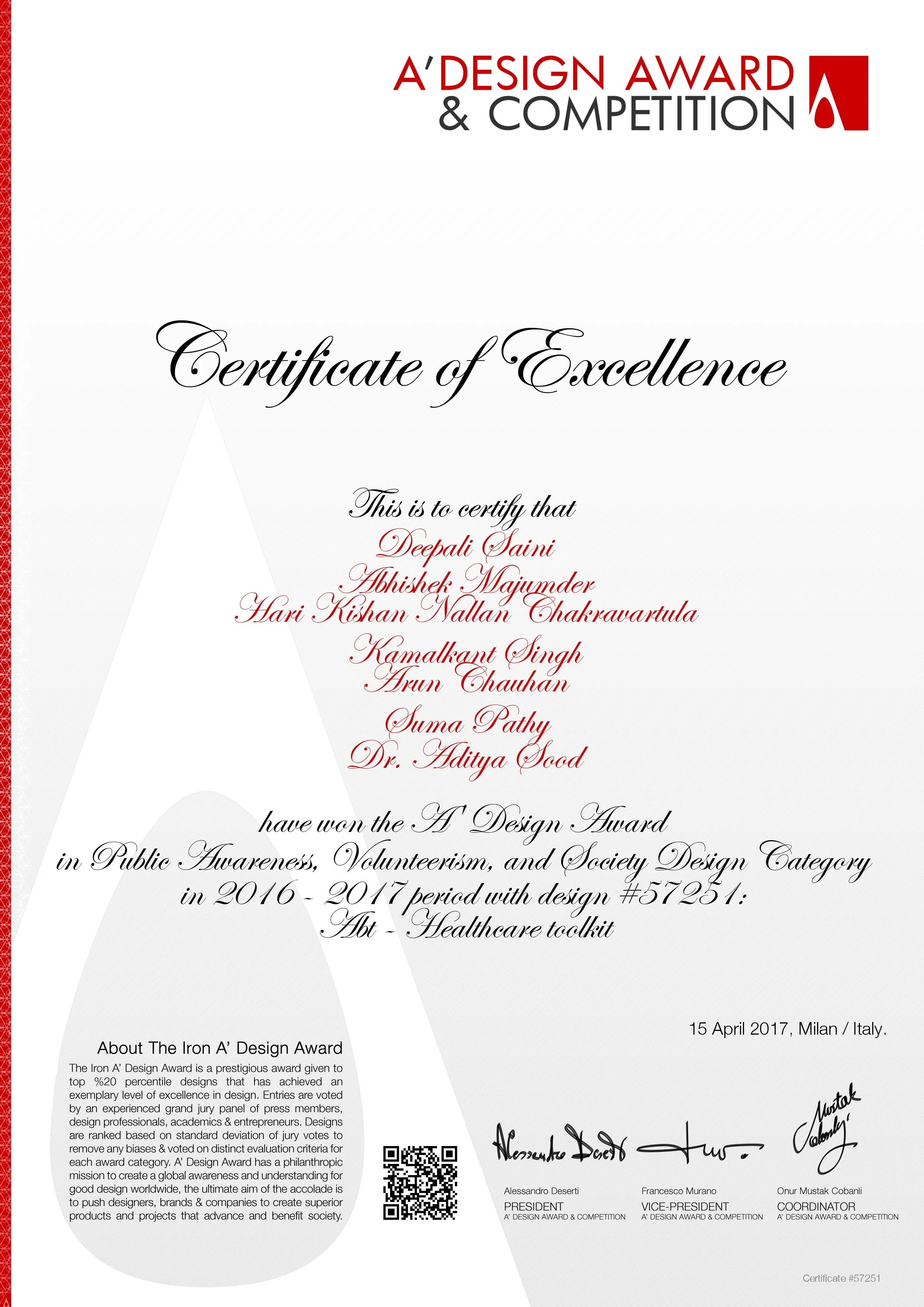 AWARD: Certificate of recognition from the A Design award and competition for work in Healthcare