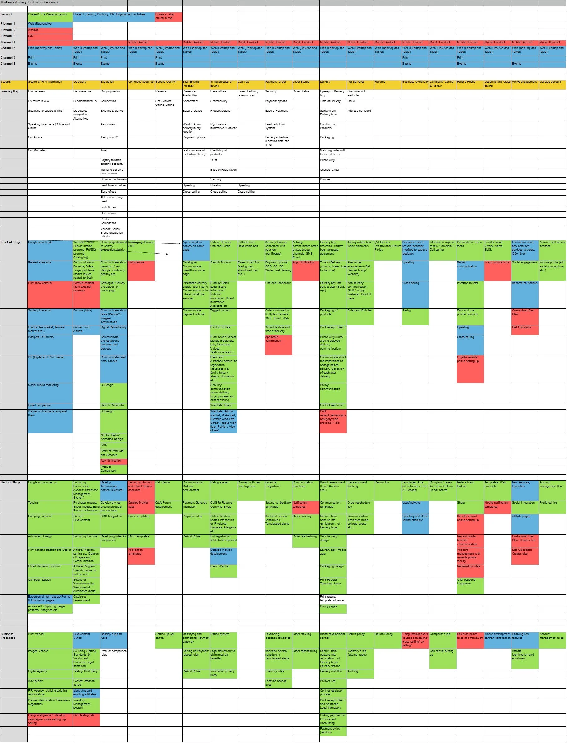 SERVICE DESIGN: A spreadsheet rendition of Service Design Blueprint. I always follow up the creative map with a spreadsheet because it then becomes data and is usable